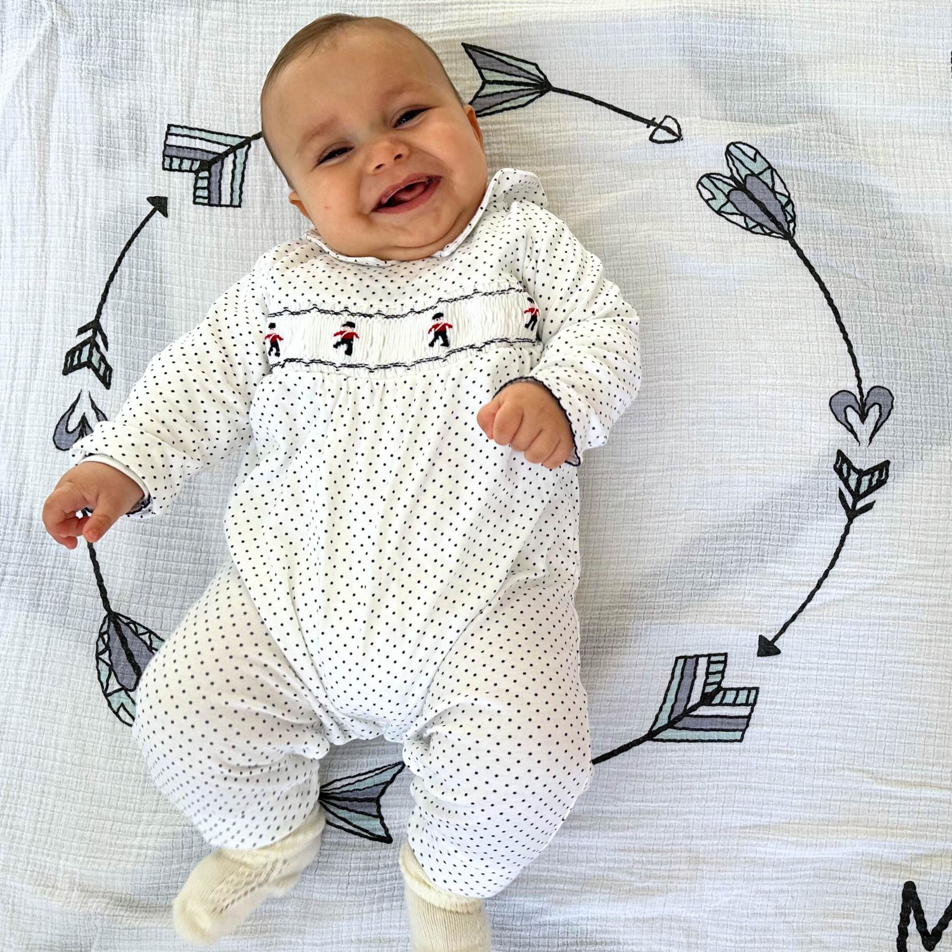 This long sleeve navy dots playsuit features a shirt-style collar and a handcrafted smocking, detailing charming toy soldiers.