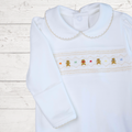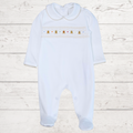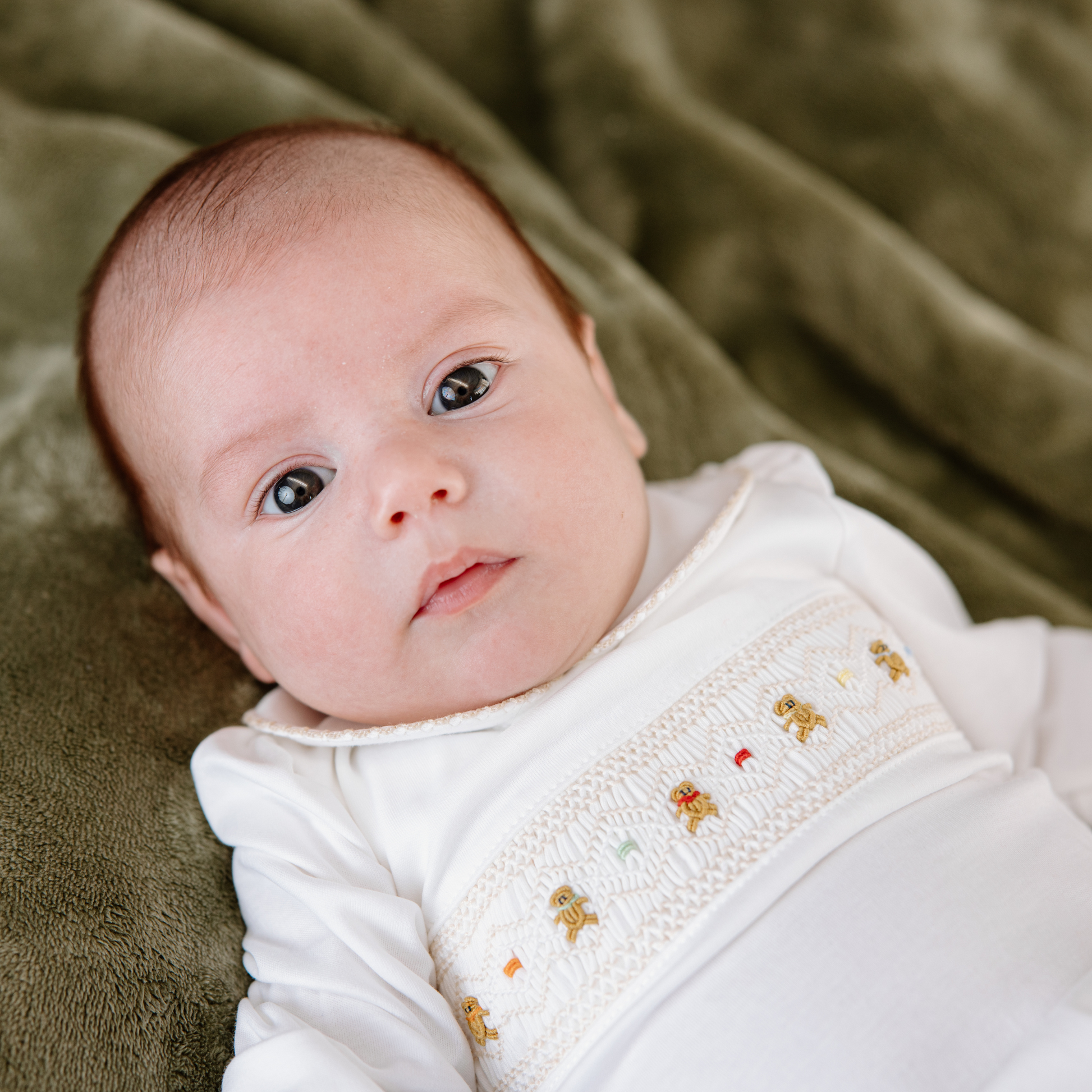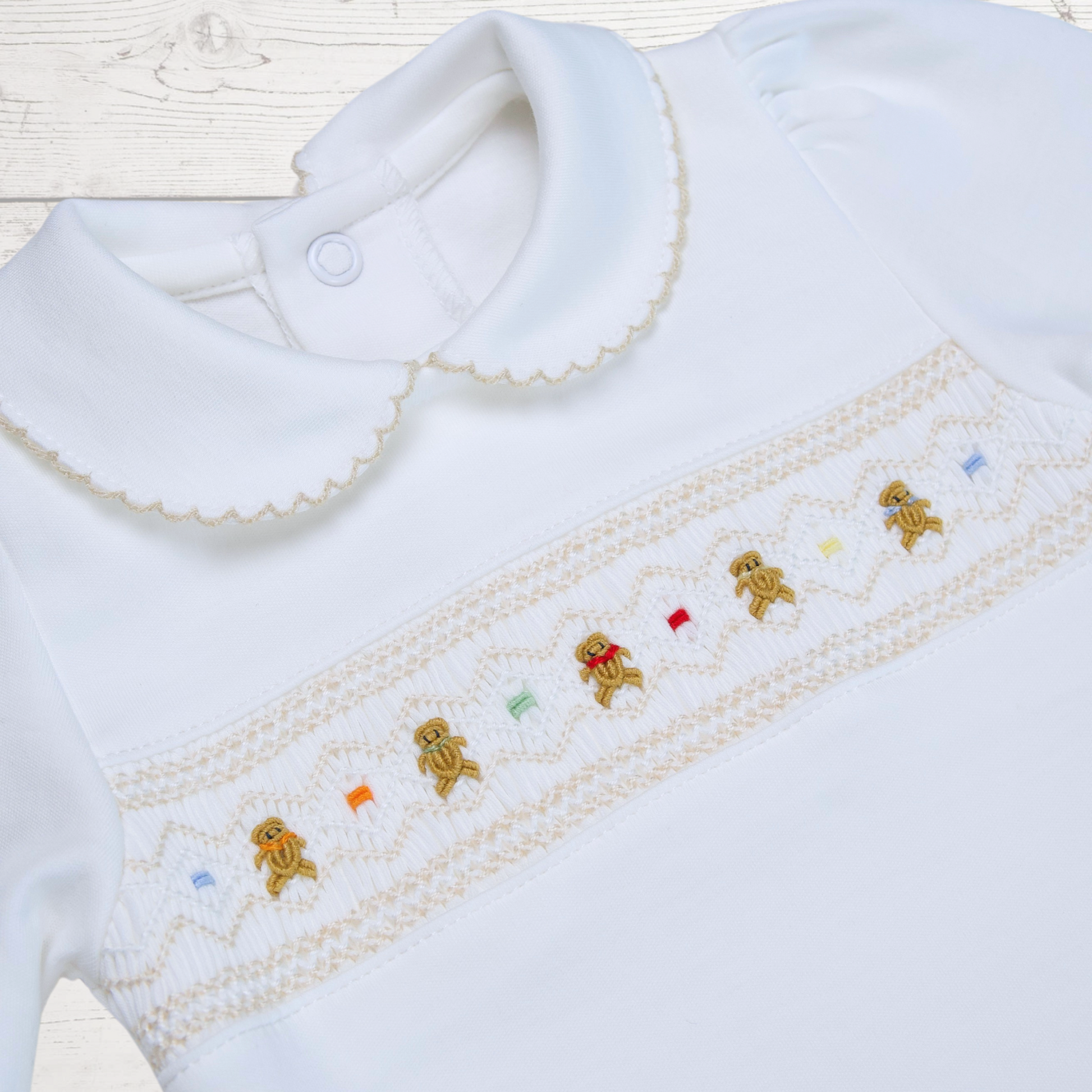 This white footed jumpsuit features delicate beige picot edging on the long sleeves and Peter Pan collar. It's beautifully detailed with handmade smocking, adorned with gender-neutral playful bears with colorful confetti, making it a perfect, thoughtful present for any baby.