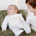 Our Smocked Peruvian Pima Cotton Footie, crafted from the finest, hypoallergenic, and thermoregulating fabric, it offers gentle care for delicate skin, ensuring your little one stays comfortable and protected from day one. Sizes 0M and 3M are equipped with integrated mittens. Ideal for: newborns, coming home outfits, newborn photoshoots, baby religious ceremonies and family gatherings.