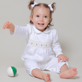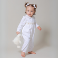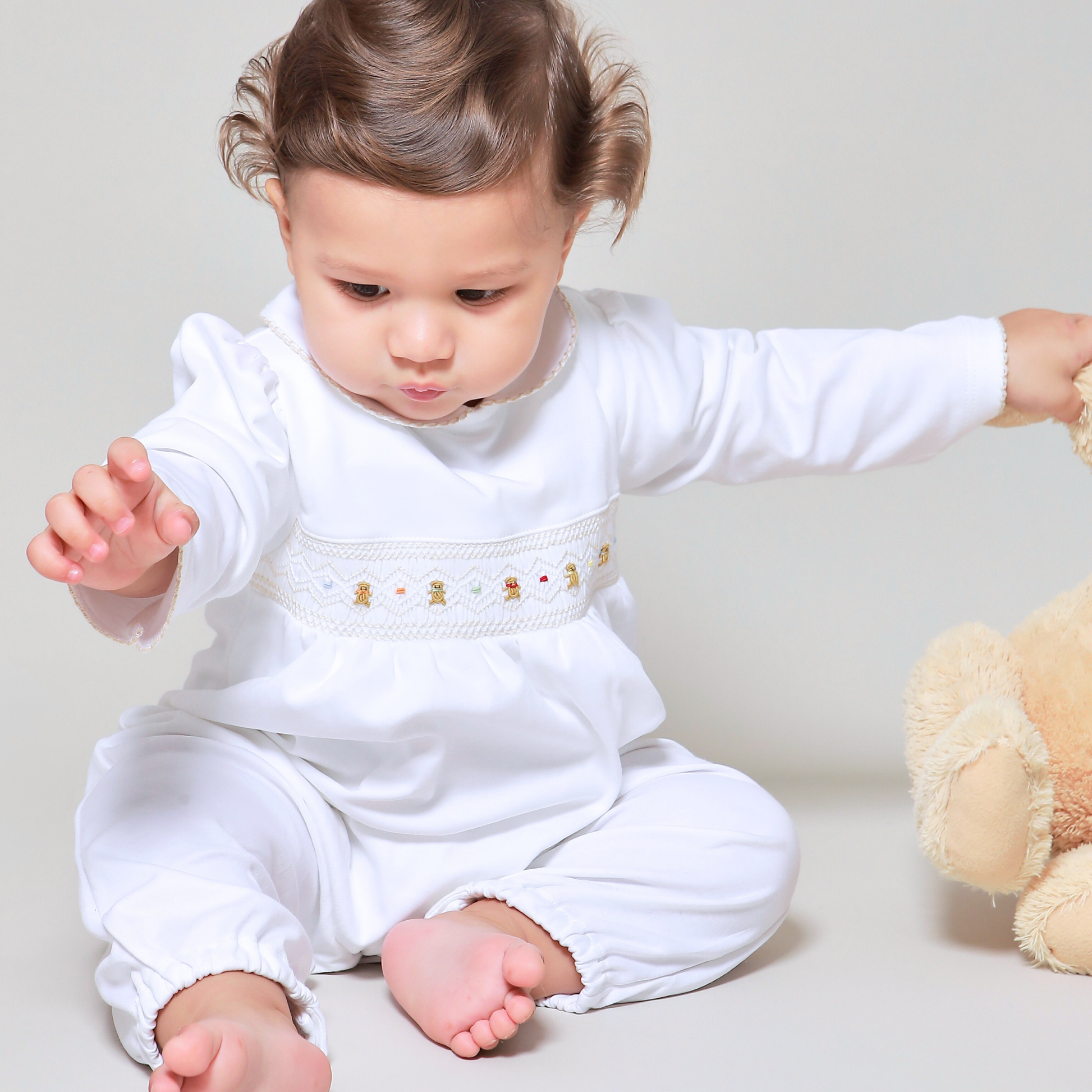 This long-sleeved white playsuit features a Peter Pan -style collar adorned with a beige picot trim and handcrafted smocking detailing playful bears with colorful confetti.