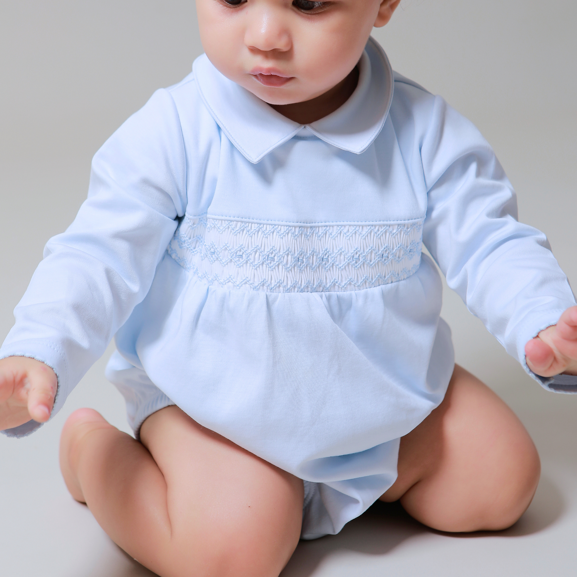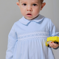 This baby blue piece features long sleeves with delicate picot edging, a shirt-style collar, and charming handmade blue smocking.