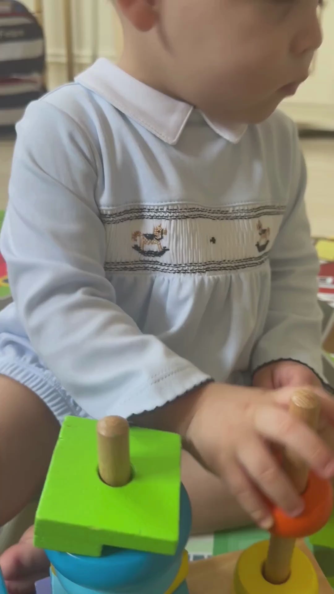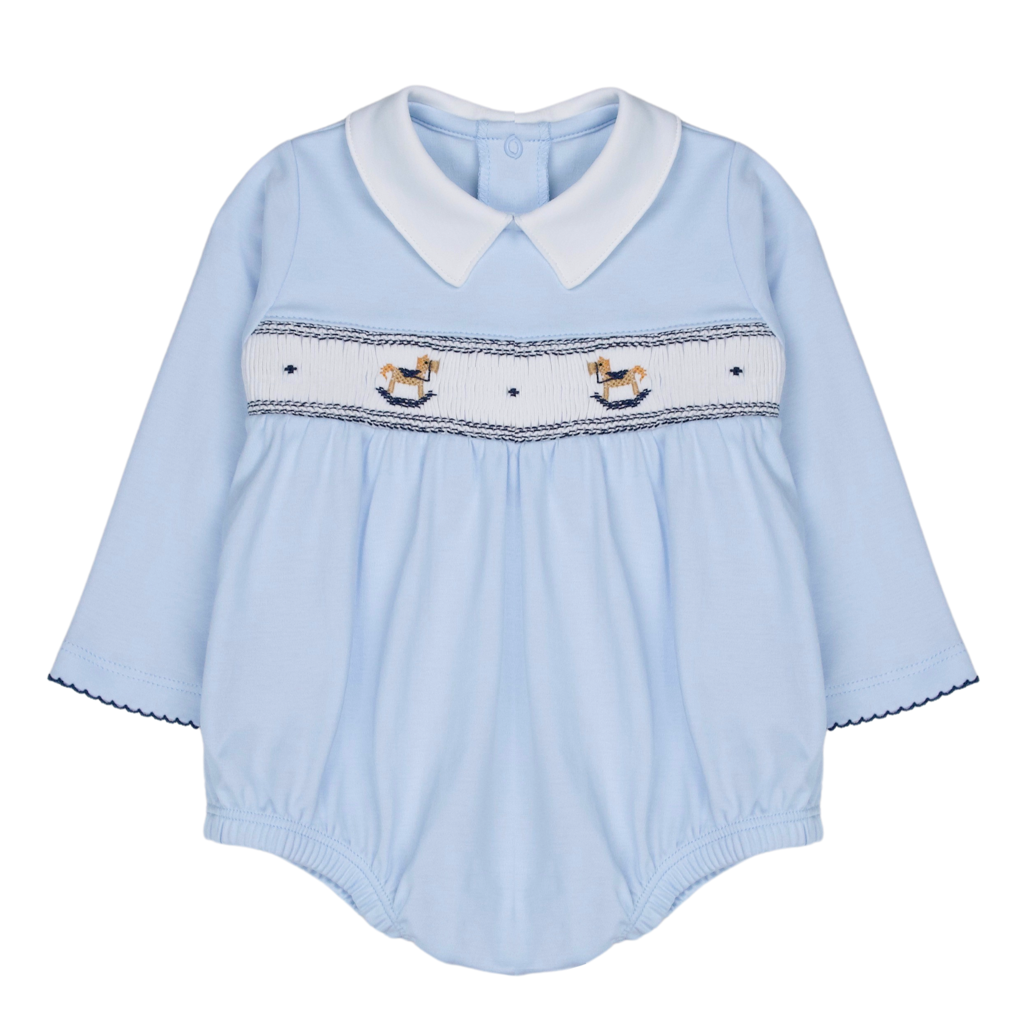 This baby blue piece features long sleeves with delicate navy picot edging, a white shirt-style collar, and charming handmade smocking of rocking horses with navy accents.