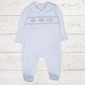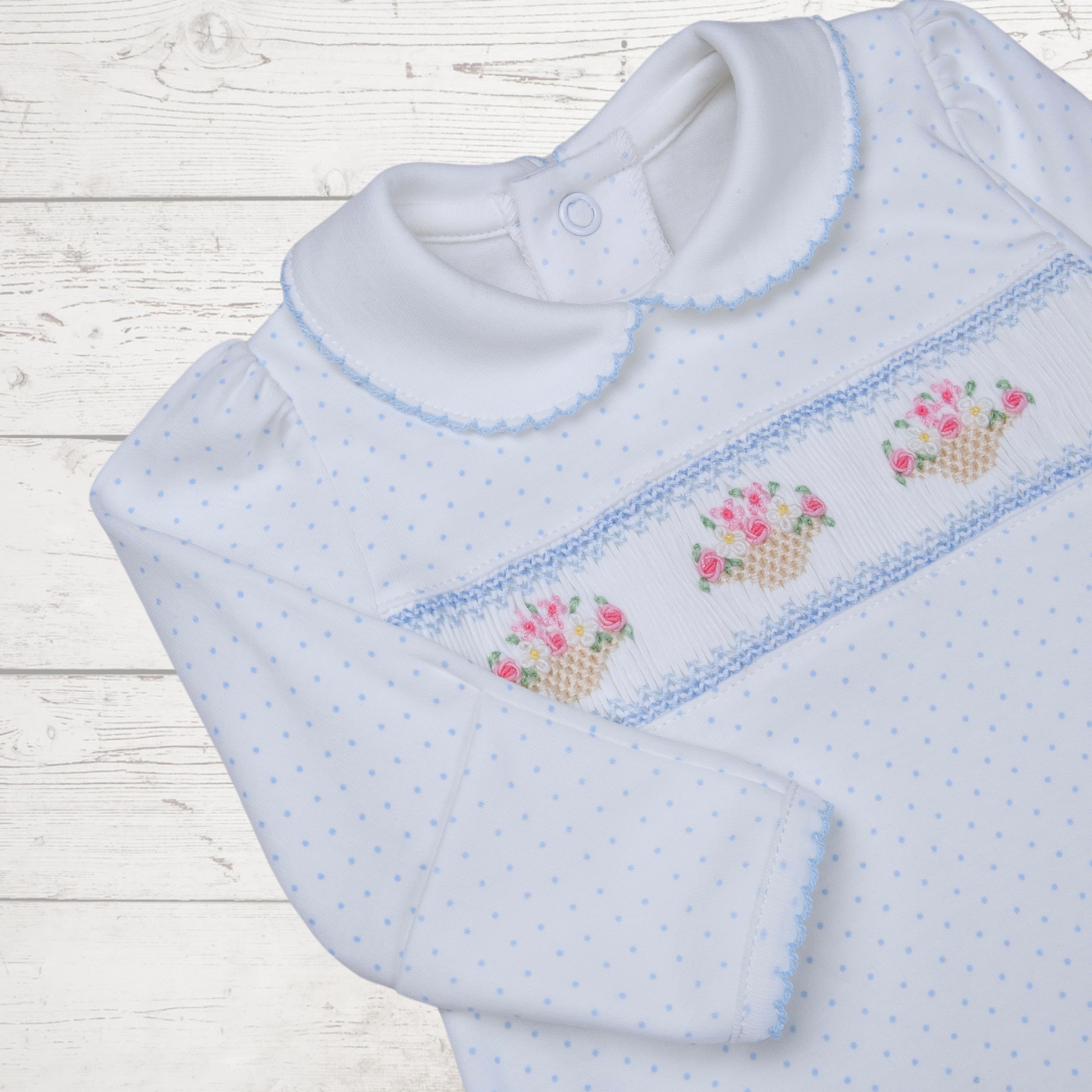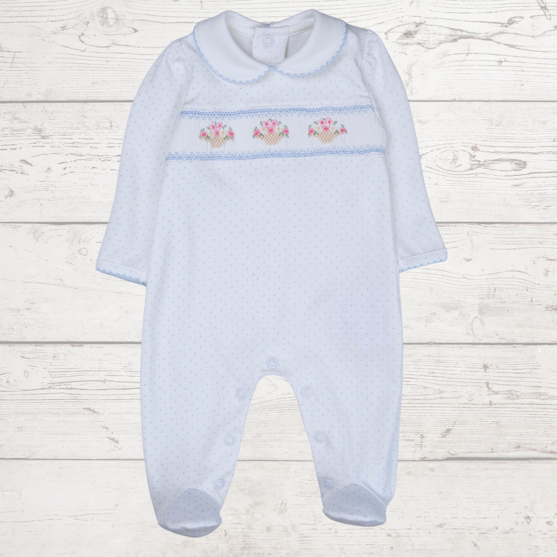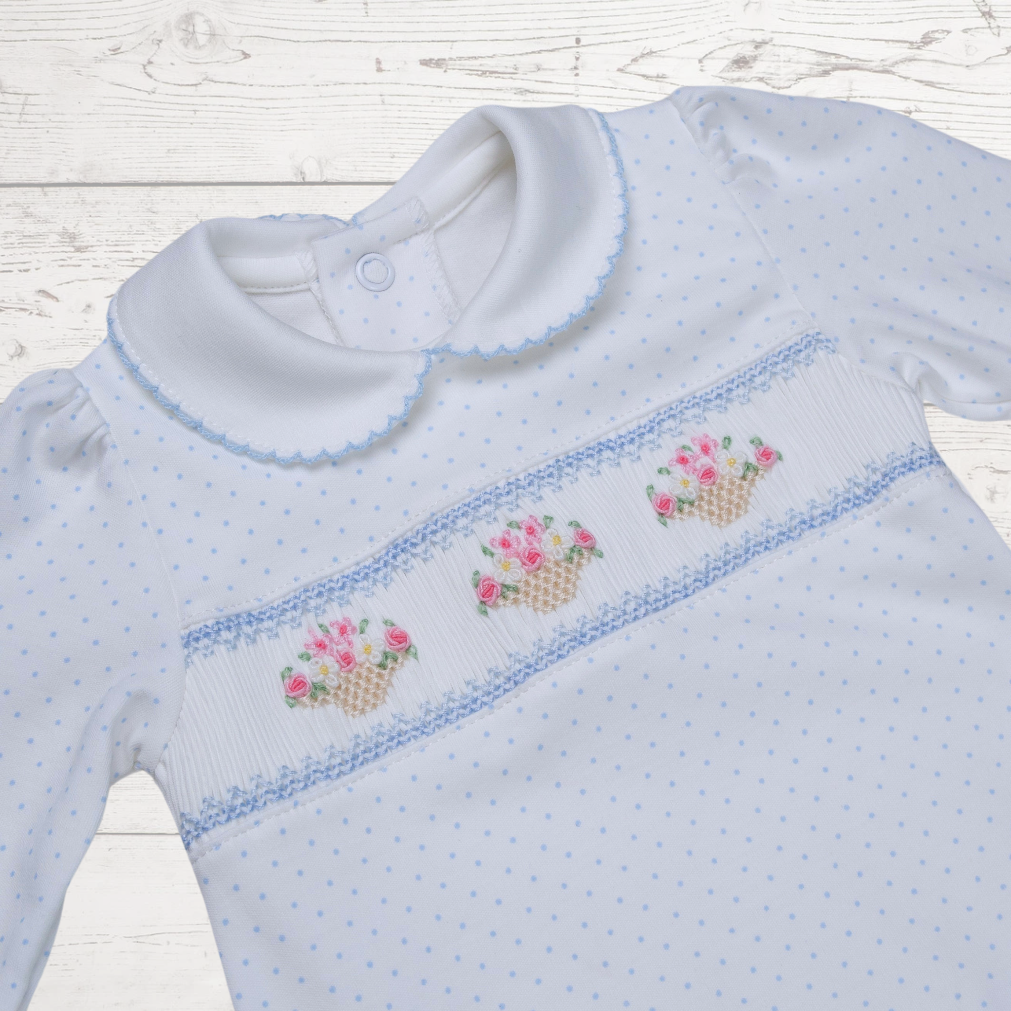 This blue dots footed jumpsuit features delicate blue picot edging on the long sleeves and Peter Pan collar. It's beautifully detailed with handmade smocking, adorned with exquisite flower baskets.