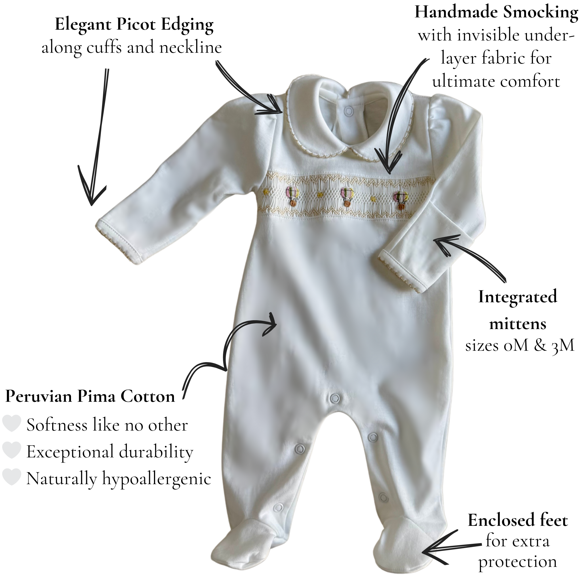 Our Smocked Peruvian Pima Cotton Footie, crafted from the finest, hypoallergenic, and thermoregulating fabric, it offers gentle care for delicate skin, ensuring your little one stays comfortable and protected from day one. Sizes 0M and 3M are equipped with integrated mittens. Ideal for: newborns, coming home outfits, newborn photoshoots, baby religious ceremonies and family gatherings.