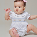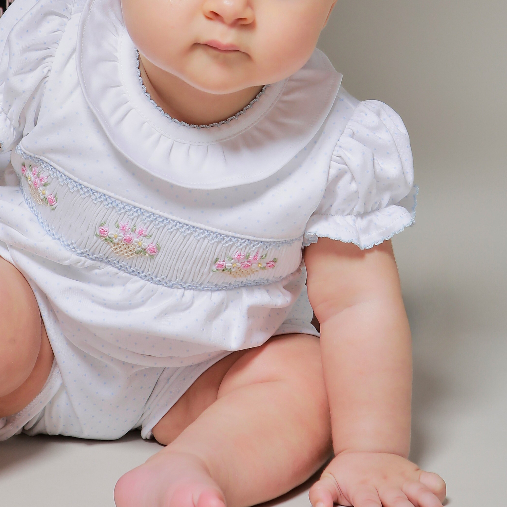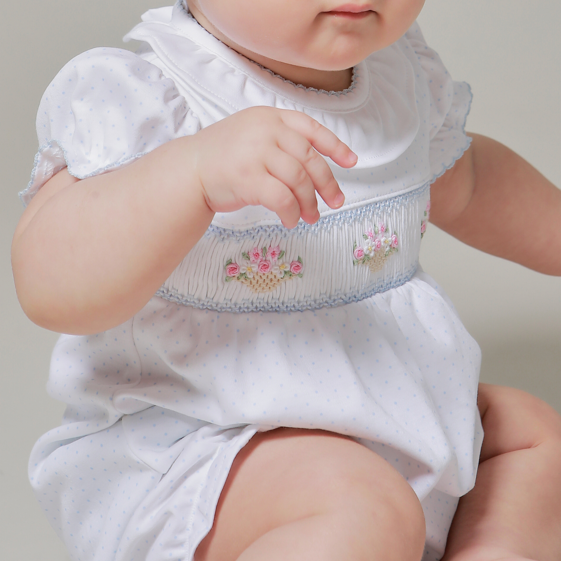This blue dots Romper features short sleeves and Peter Pan-style collar adorned with delicate blue picot edging and charming handcrafted smocking, detailing exquisite flower baskets.