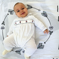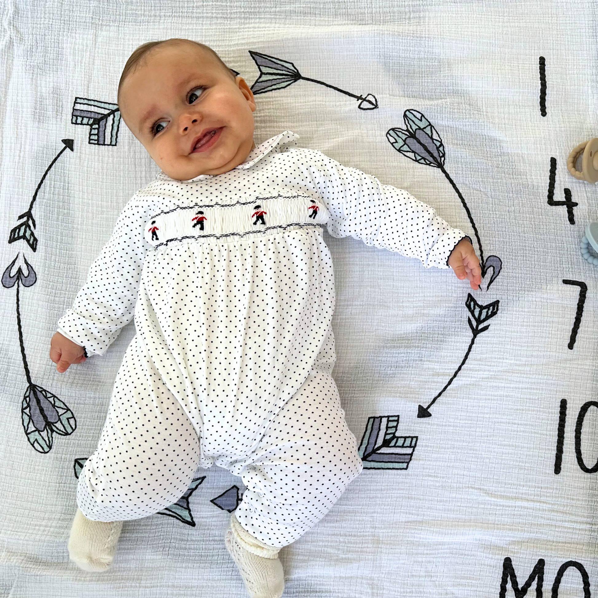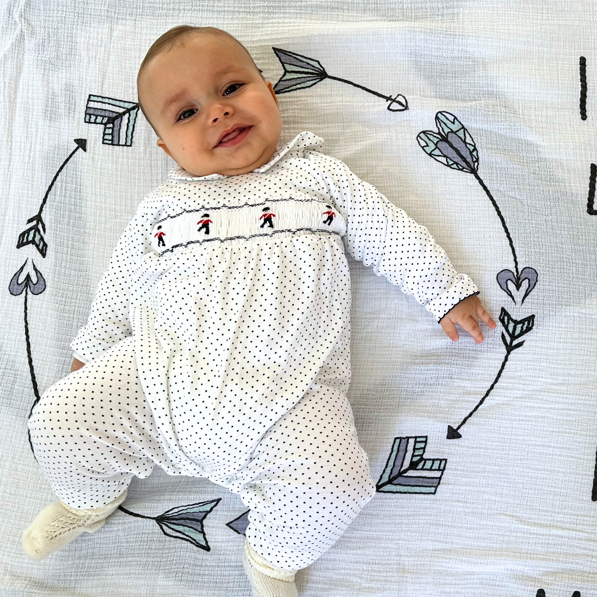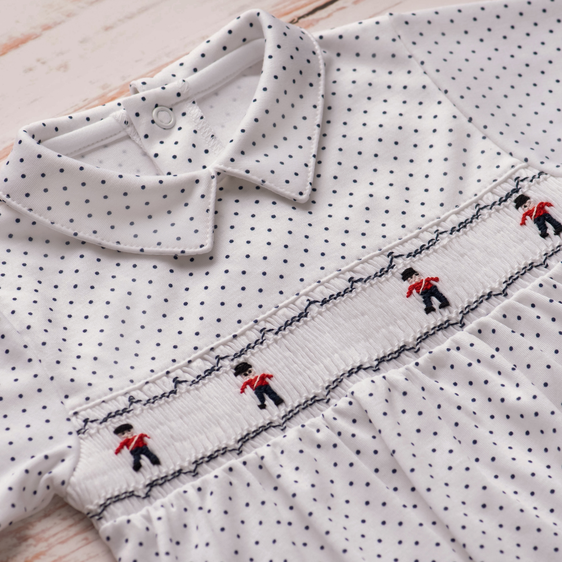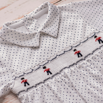 This long sleeve navy dots playsuit features a shirt-style collar and a handcrafted smocking, detailing charming toy soldiers.